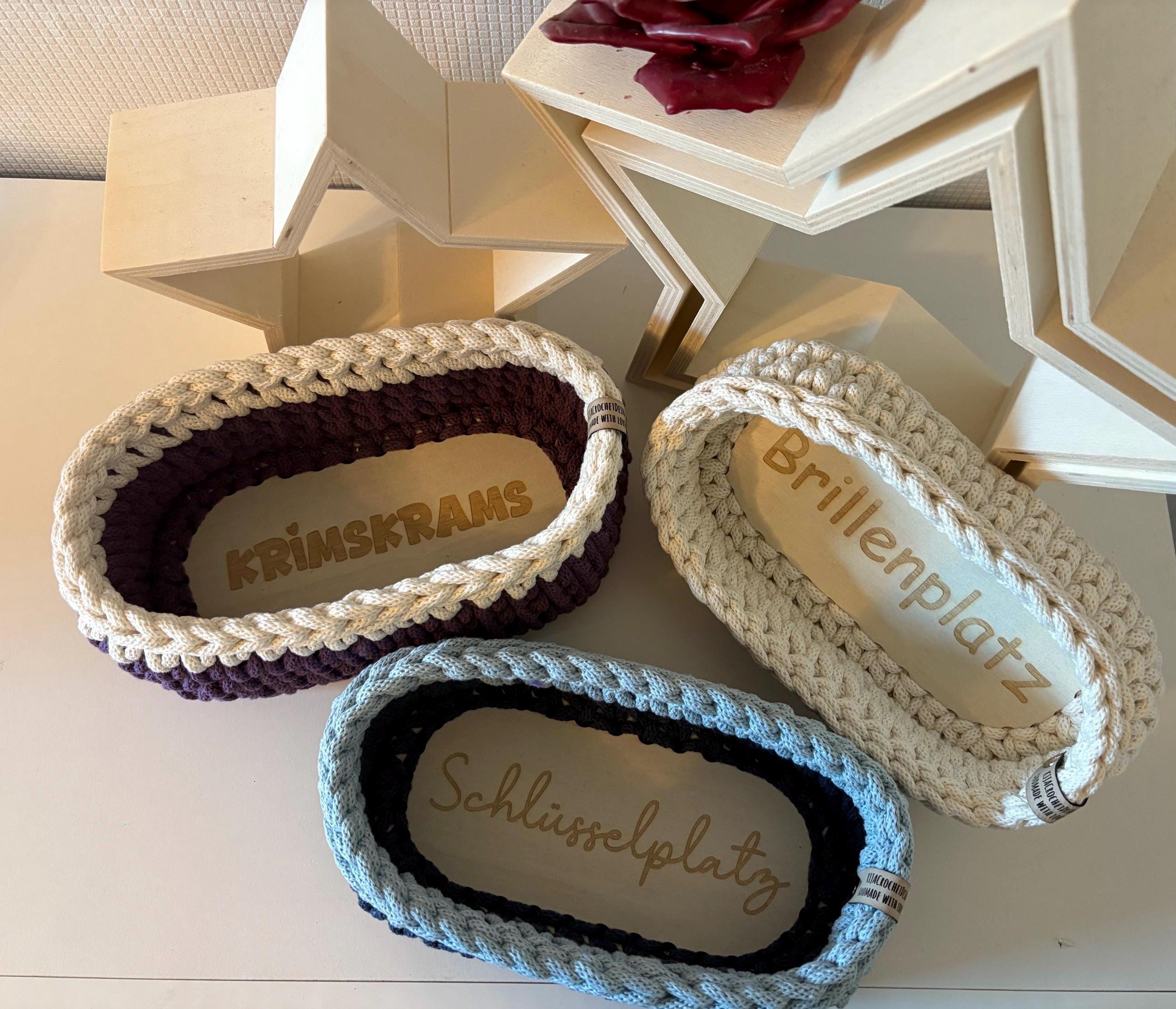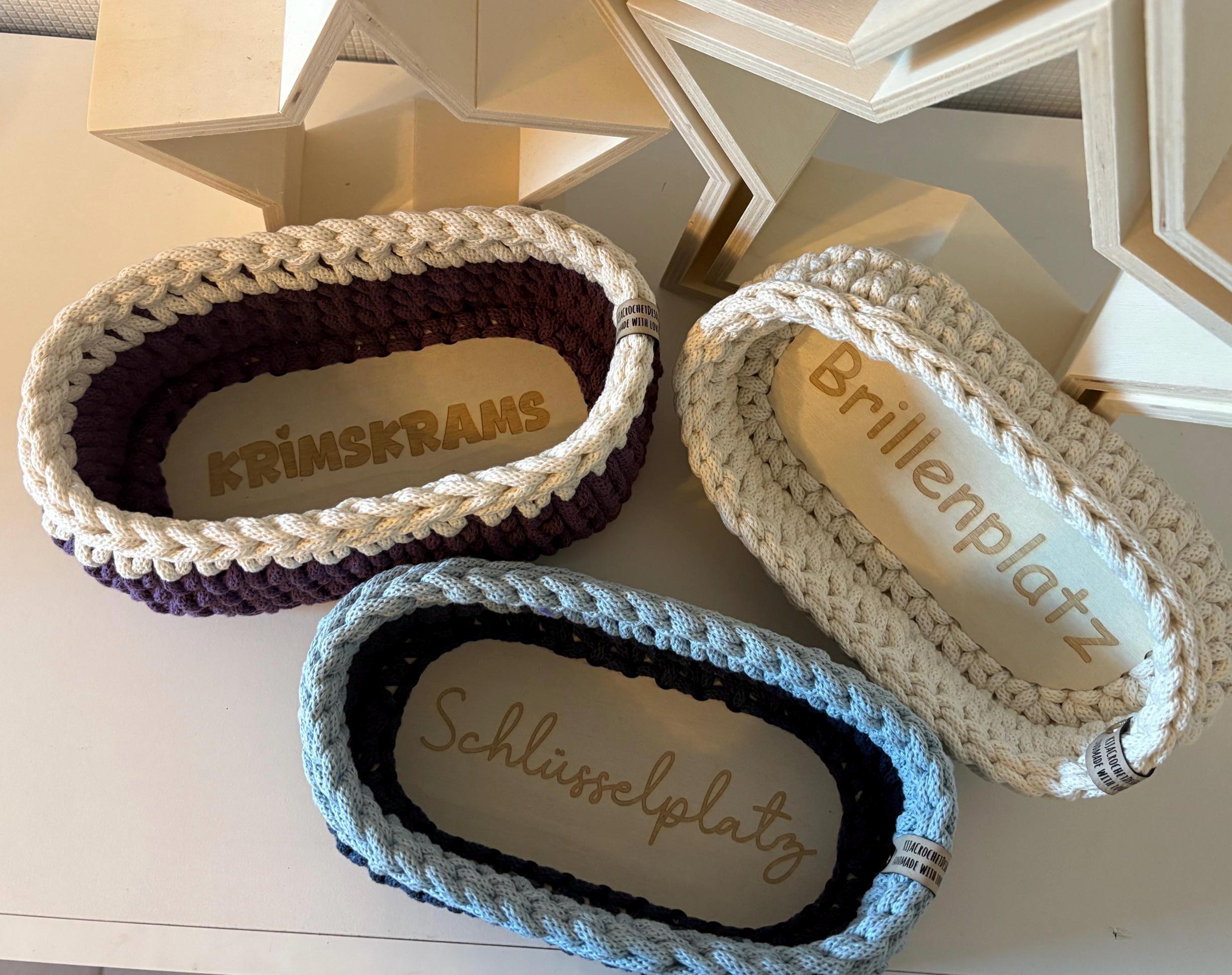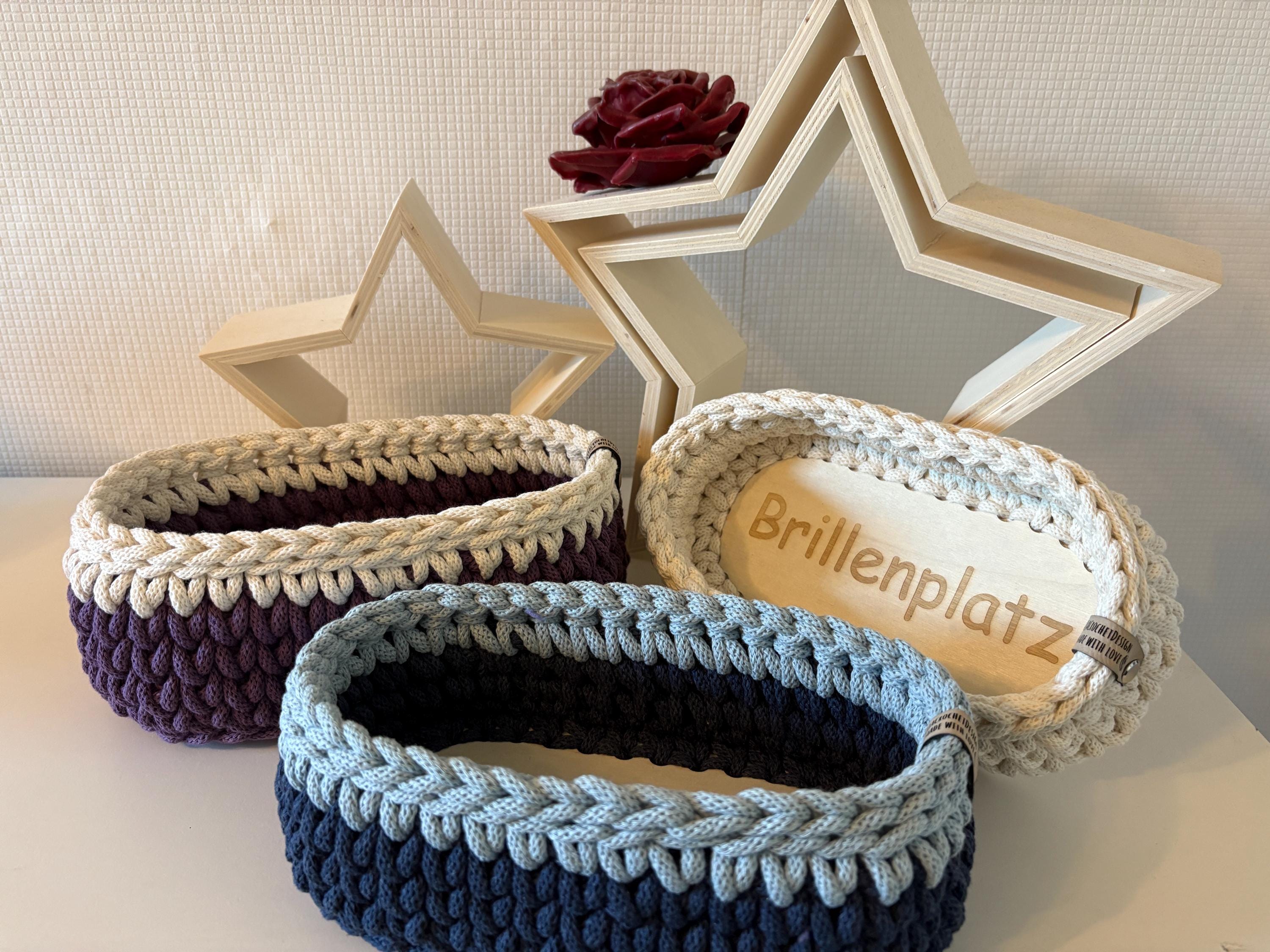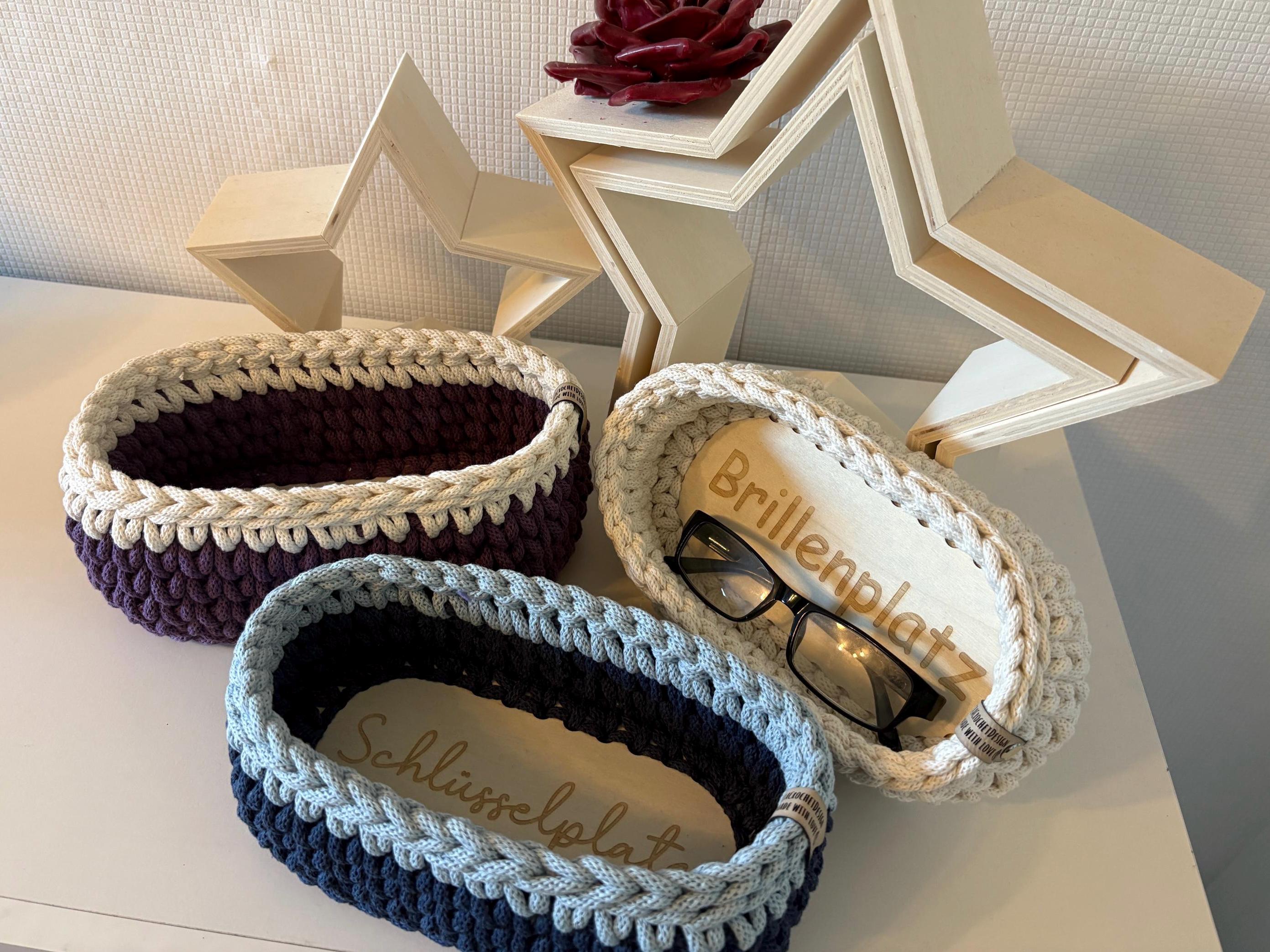 These small baskets with wooden bottoms are crocheted with 5 mm Bobbiny yarn and are perfect for household storage. The offer and price are for one basket.